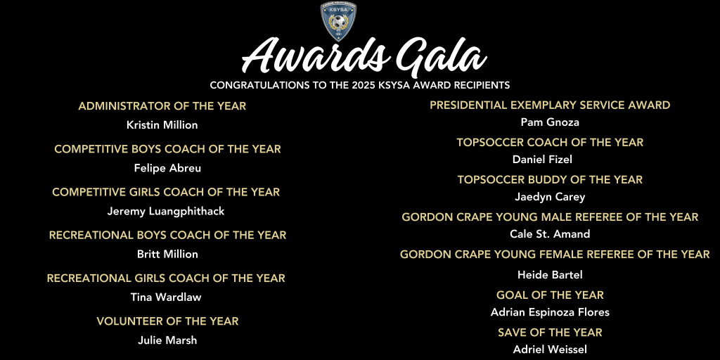 Each year individuals are recognized in various categories and represent Kansas Youth Soccer at the Midwest Regional. If individuals are selected as Regional award winners, they represent the Midwest Region at the US Youth Soccer Awards Gala in conjunction with the US Youth Soccer Convention. Individuals chosen at the Awards Gala become National Level winners in their respective category. In addition to State awards, the Kansas Youth Soccer Association honors Kansas Hall of Fame Inductees.